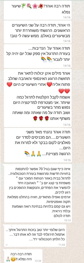 למרות הקושי שלי לשתף את הטכנולוגיה ולתרגל מול המחשב, הצלחתי בעזרתך להתחבר ולחוש את האנרגיה הטובה עוברת בין הלבבות של כולם.