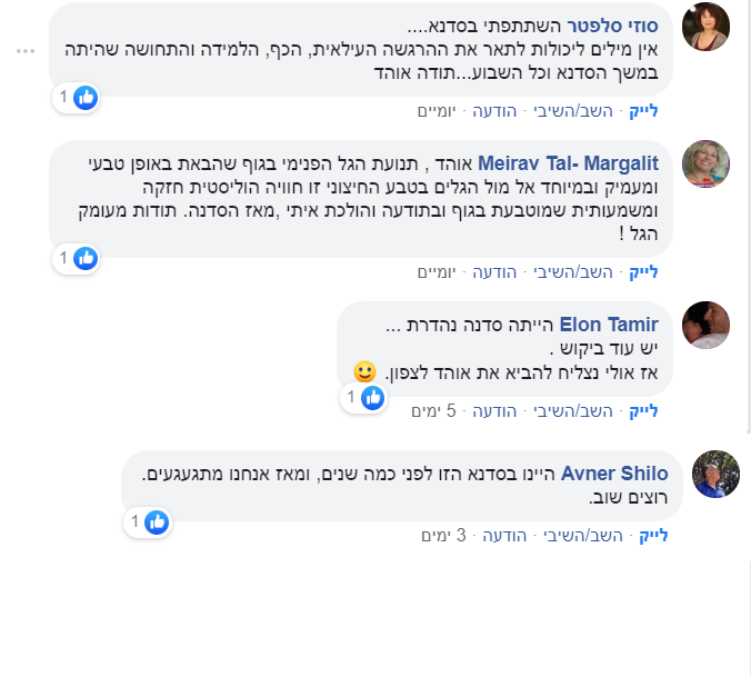 הסדנה התפתחה כל-כך נכון מבחינת גוף-נפש ואיפשרה מקום לרוח ולחיבורים שמעבר למוחשי (הרגעים הקסומים על שפת הים).